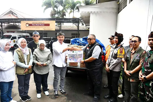 Prakata.com - Penjabat (Pj) Gubernur Jawa Barat (Jabar) Bey Machmudin, menyerahkan bantuan berupa telur, susu dan yoghurt untuk warga Kabupaten Sukabumi yang terdampak bencana banjir, longsor dan pergerakan tanah.